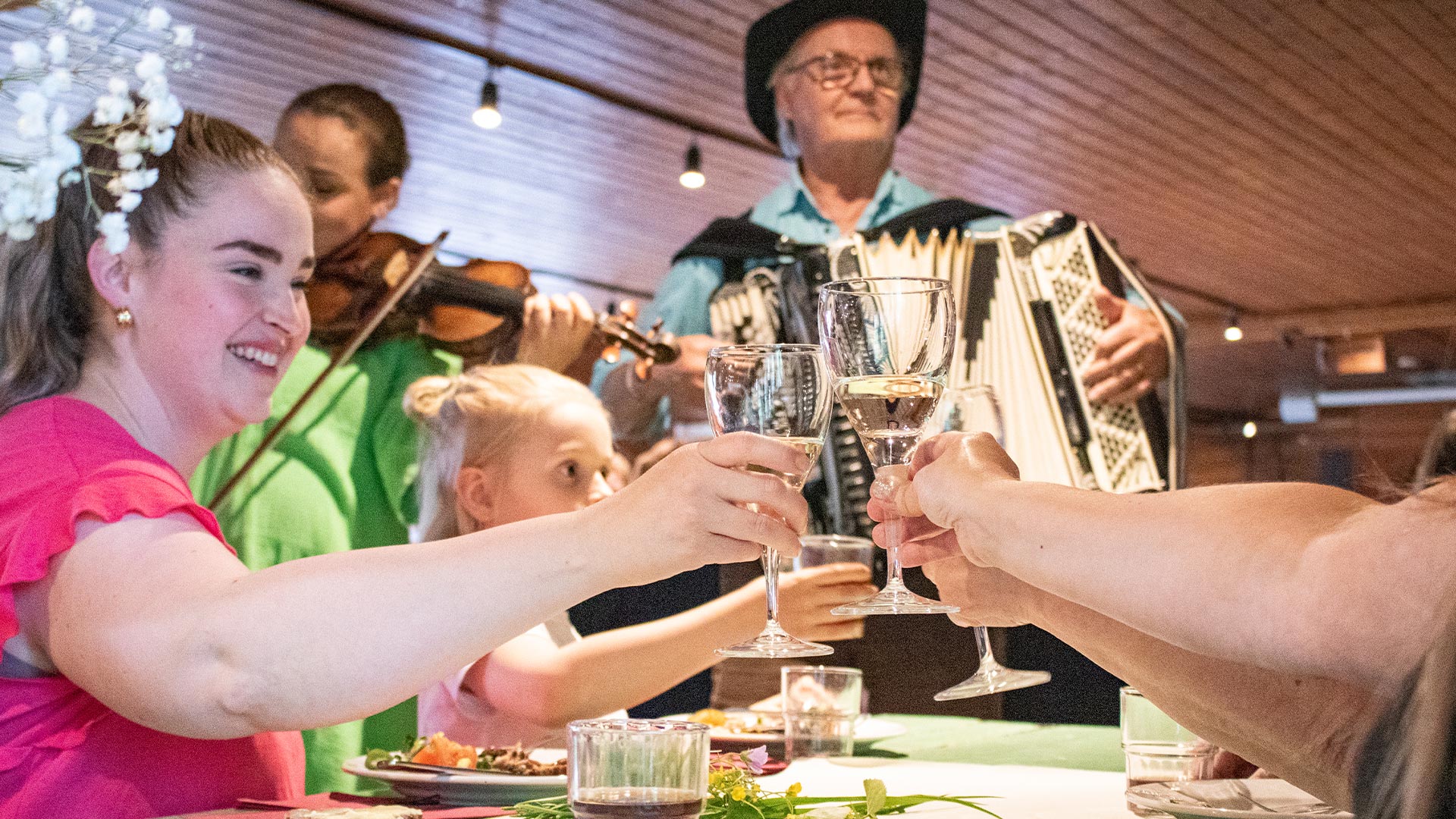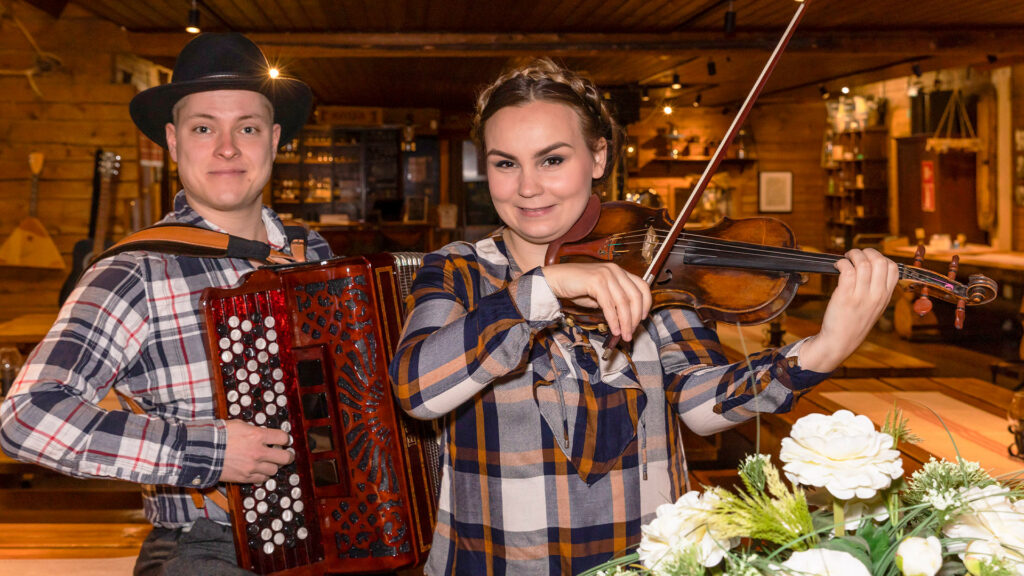Hanuristi ja viulisti luovat tunnelmaa, ja ilta huipentuu yhteislauluun ja tanssiin.