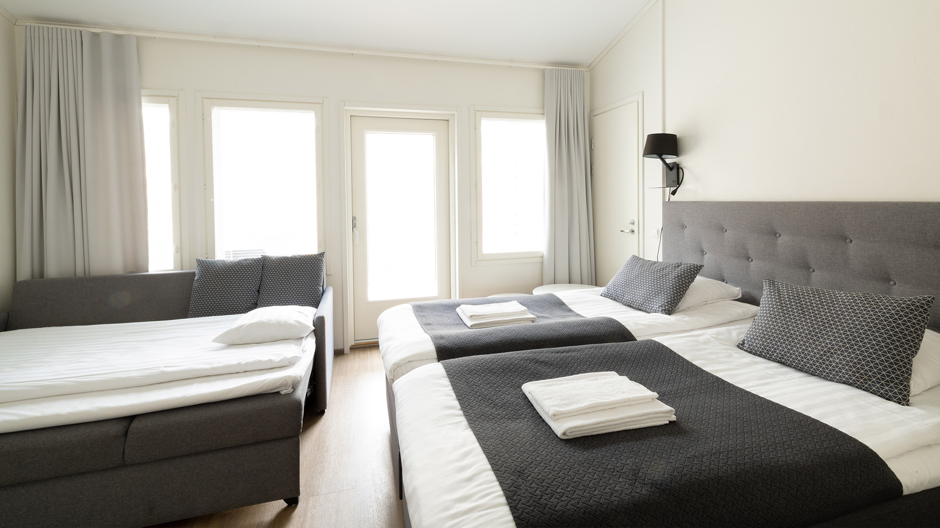 Sopii yksin matkustaville, pariskunnille ja pienille perheille. Huonekoko 22-24 m2. Vuoteet kahdelle. Lisäksi 2 h vuodesohva.